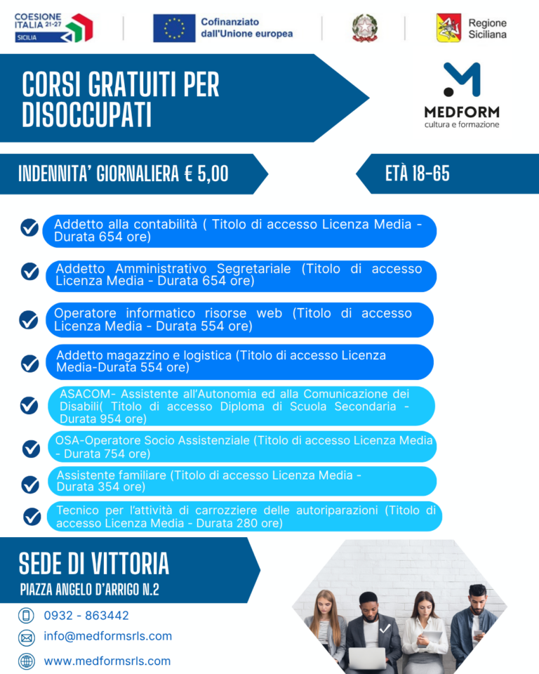 Medform progetta, organizza ed eroga in proprio e per conto terzi corsi di formazione finalizzati all’acquisizione e allo sviluppo delle competenze professionali, all’inserimento o alla riqualificazione lavorativa. L’obiettivo principale è quello di migliorare e ottimizzare i processi produttivi fornendo, attraverso una consulenza specializzata di esperti del settore, soluzioni, ad ogni tipo di esigenza e necessità proponendo gli strumenti formativi che si adattano ai bisogni individuati. I contenuti e la durata dei corsi si adattano alle necessità dell’azienda con lo scopo di fornire un servizio personalizzato ed efficace, costruito su misura delle reali esigenze formative.
